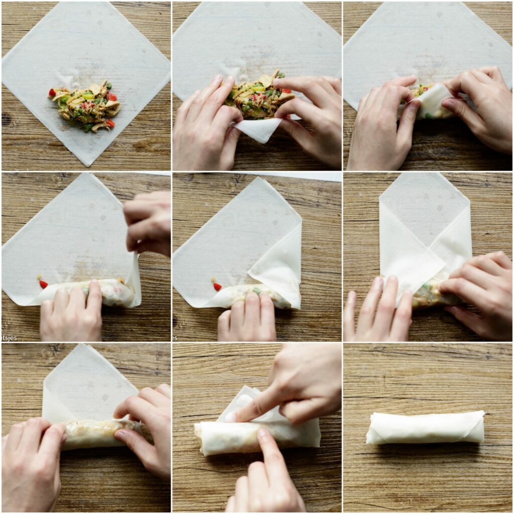 - Zorg dat de vulling goed omsloten is door het velletje, anders zal tijdens het bakken de loempia uit elkaar vallen.